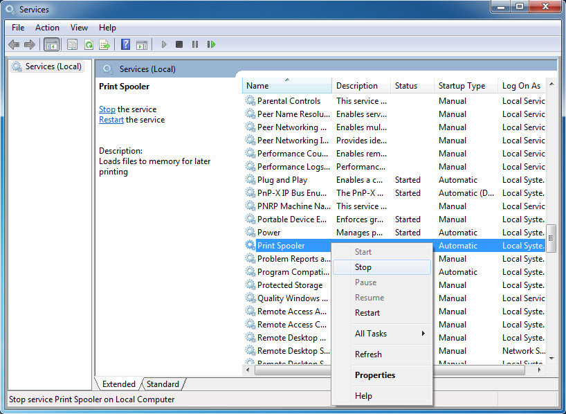 Scroll down and find "Printer Spooler."" Right-click and stop the service.